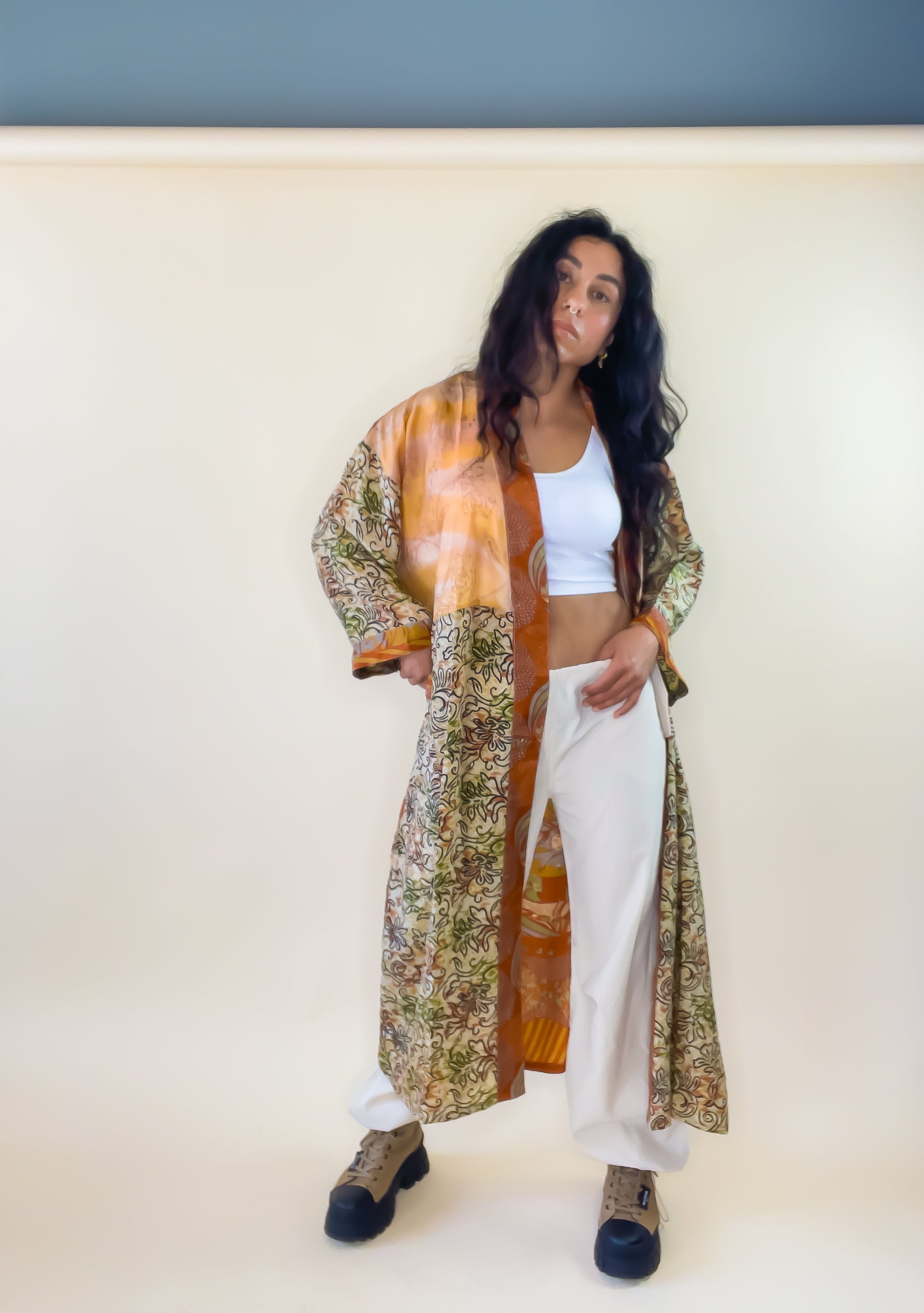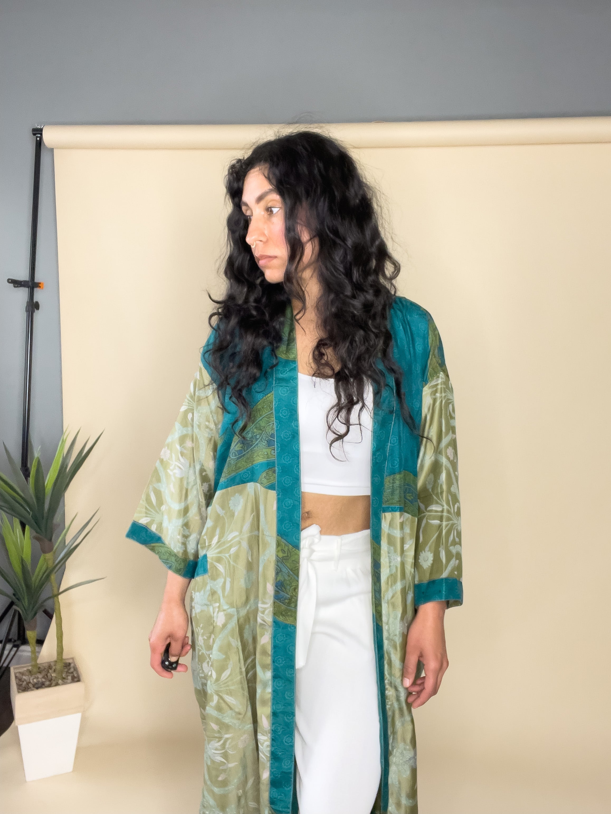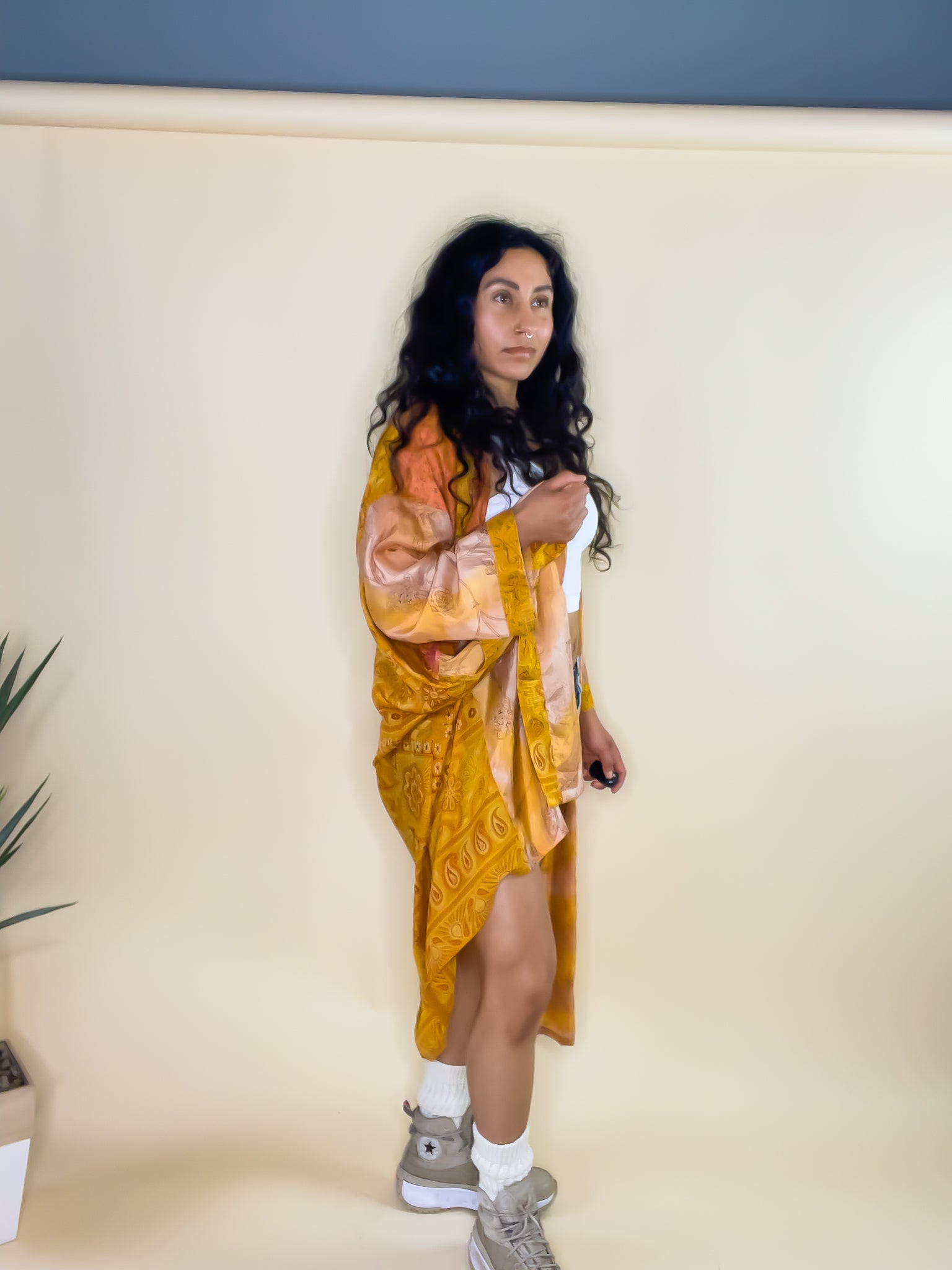 Our kimonos are made from upcycled Indian silk sarees, each with its own vibrant colors and timeless design. Every piece is truly one of a kind. Wear a kimono that’s as unique and special as you are!