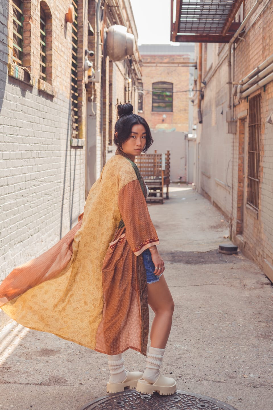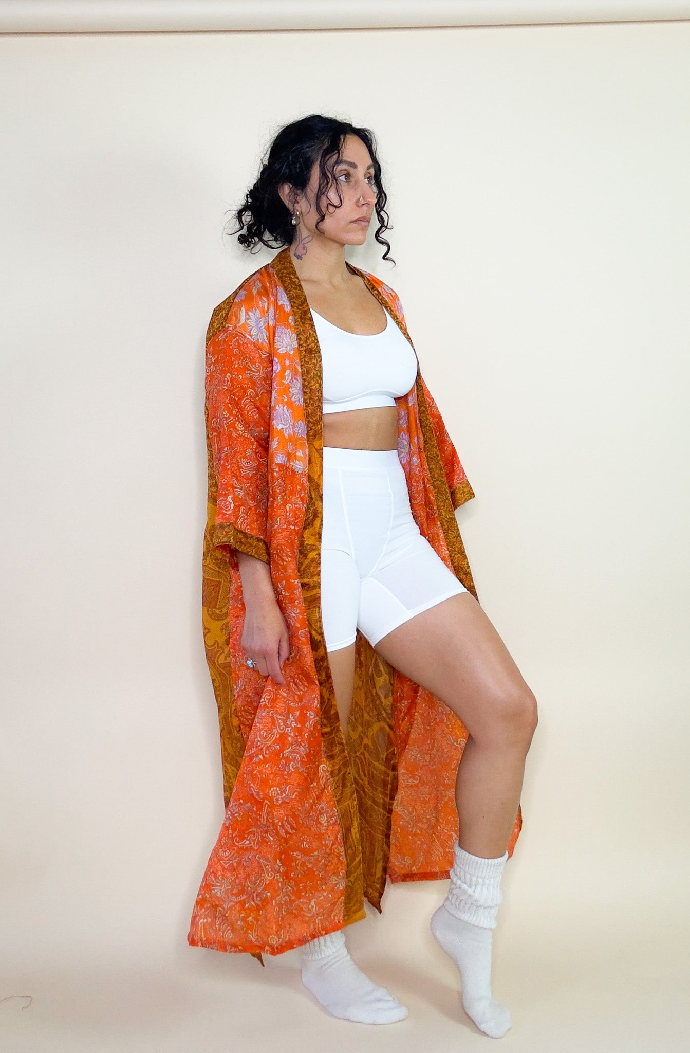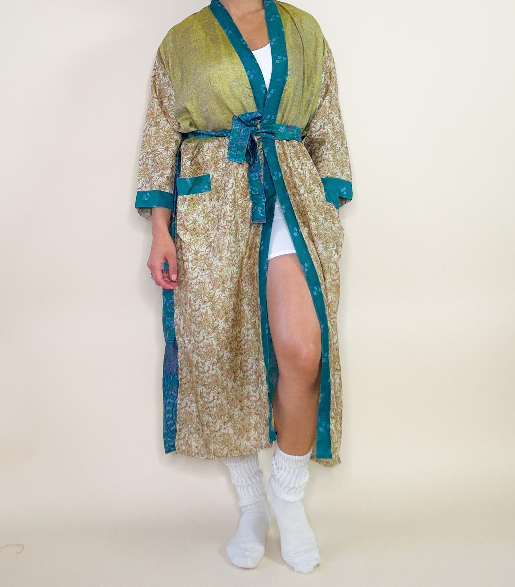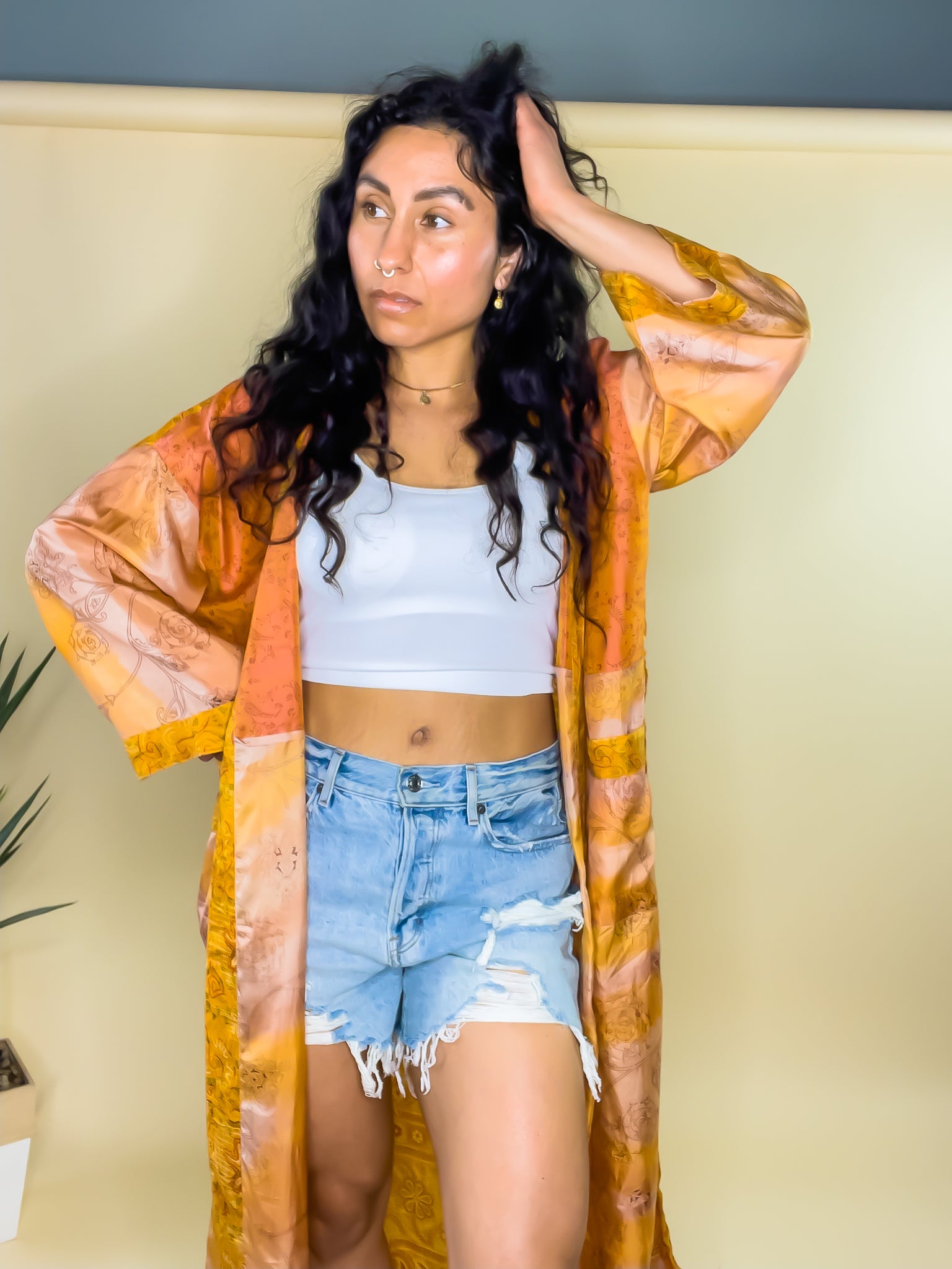 Our kimonos are made from upcycled Indian silk sarees, each with its own vibrant colors and timeless design. Every piece is truly one of a kind. Wear a kimono that’s as unique and special as you are!